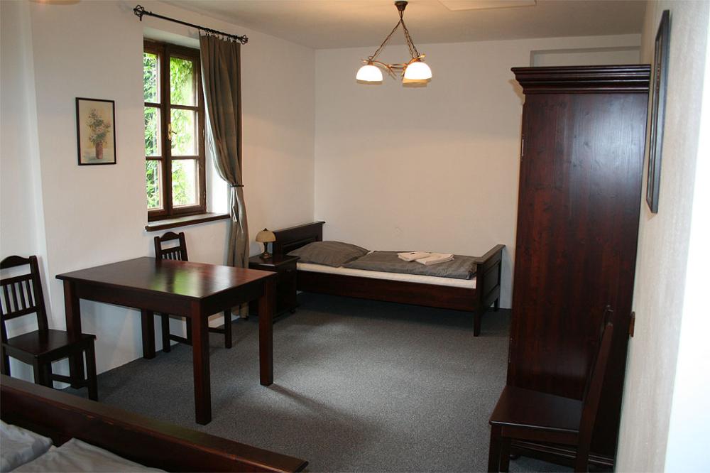 Z oken pokojů se otevírají krásné výhledy do zahrady, na kostel nebo na náměstí s rybníčkem. Interiér je laděn v přírodních barvách, doplněný o masivní dřevěný nábytek, který dokonale zapadá do atmosféry domu. Každý pokoj je vybaven stolem se židlemi, šatní skříní a má vysoké stropy, díky nimž působí vzdušně a klidně.
